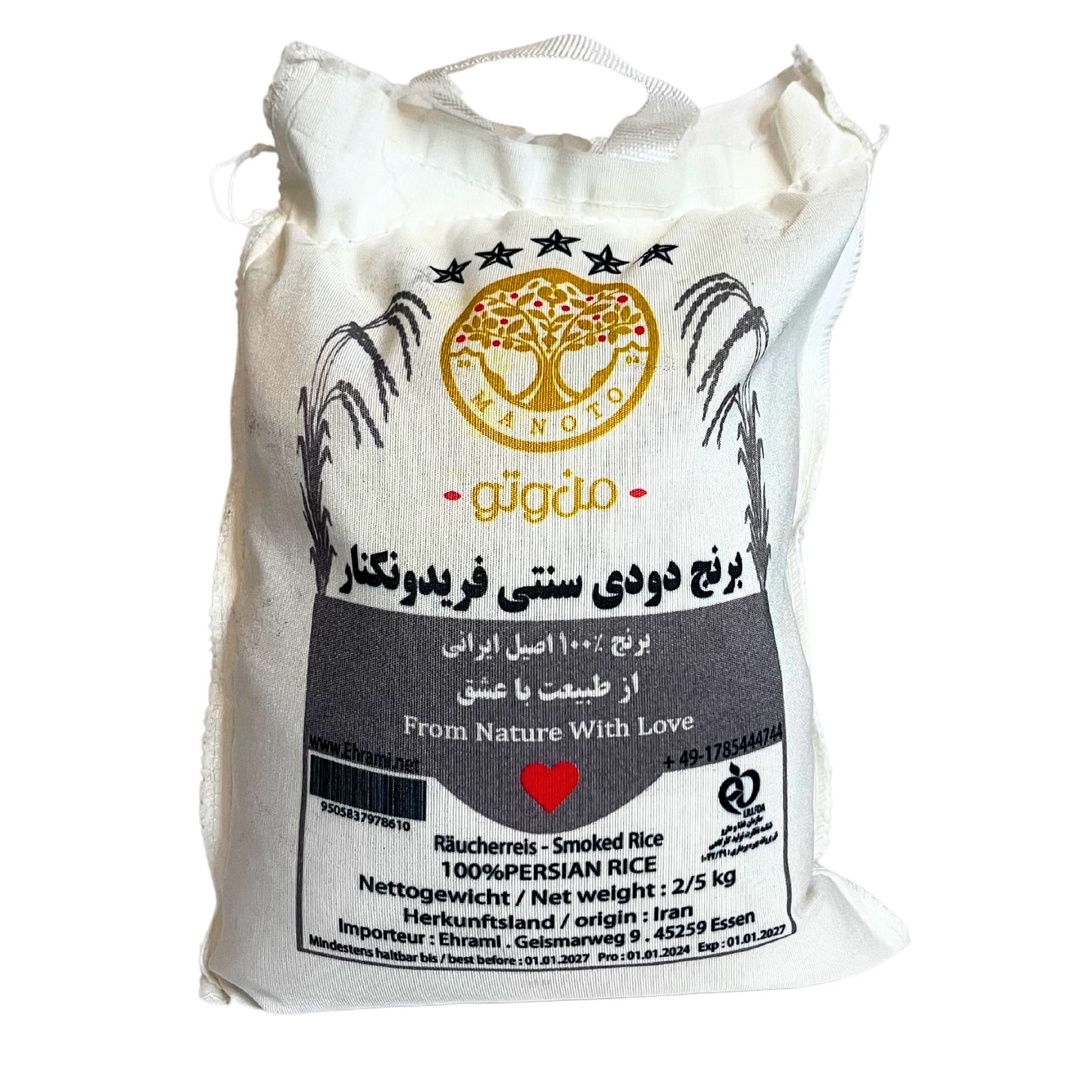 Geräucherter Reis, im Persischen als „Dudi“ bekannt, ist ein echtes Geschmackserlebnis. Durch ein spezielles Räucherverfahren erhält dieser Langkornreis ein intensives, rauchiges Aroma, das ihn deutlich von herkömmlichem Reis unterscheidet. Die Methode stammt aus alten Traditionen, bei denen der Reis in Räucherkammern mit natürlichem Rauch aromatisiert wird – ganz ohne künstliche Zusätze.