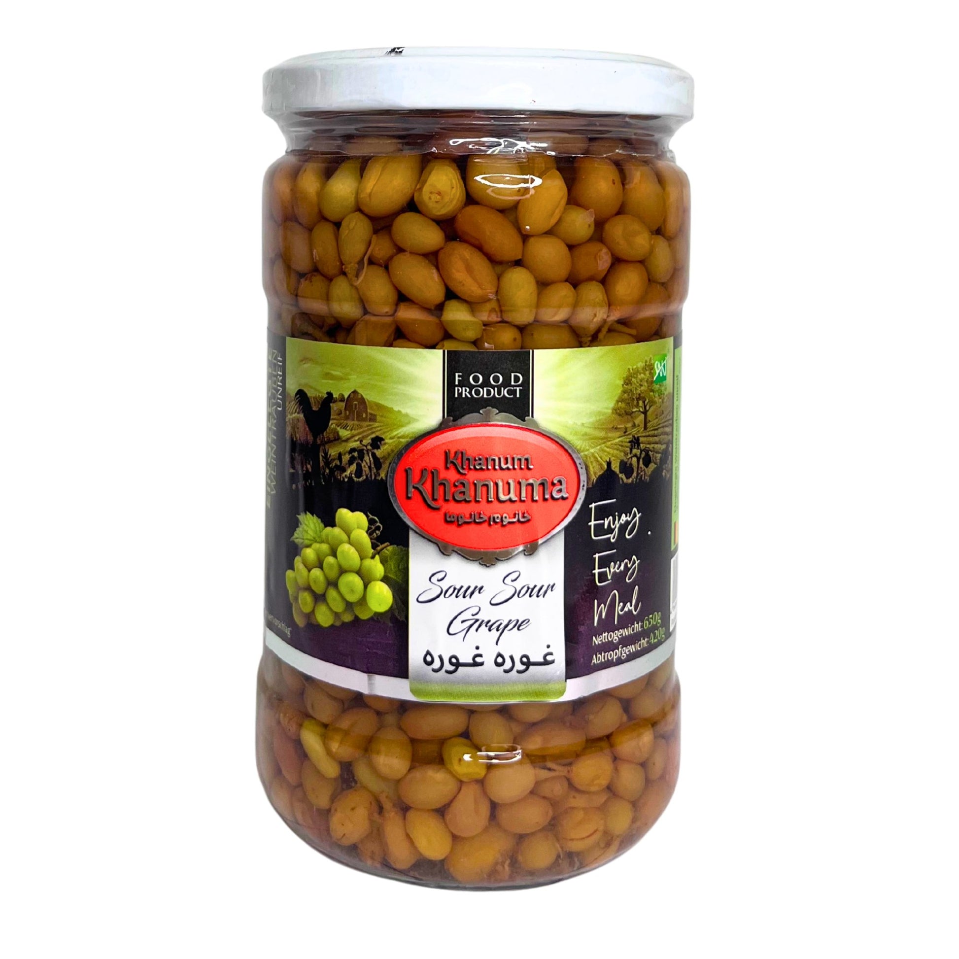 Diese eingelegten, unreifen Weintrauben bringen mit ihrer fein säuerlichen Note und dem unverwechselbaren Aroma eine besondere Würze in die Küche. Sorgfältig nach persischer Art in einer würzigen Essig-Salzlake eingelegt, entfalten sie ein frisches, fruchtiges Geschmackserlebnis mit einem angenehm herben Abgang.
